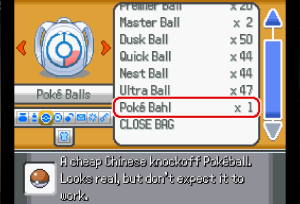 [[File:Poke Bahl.png|thumb|Description of the Poké Bahl item in the character’s bag.]]